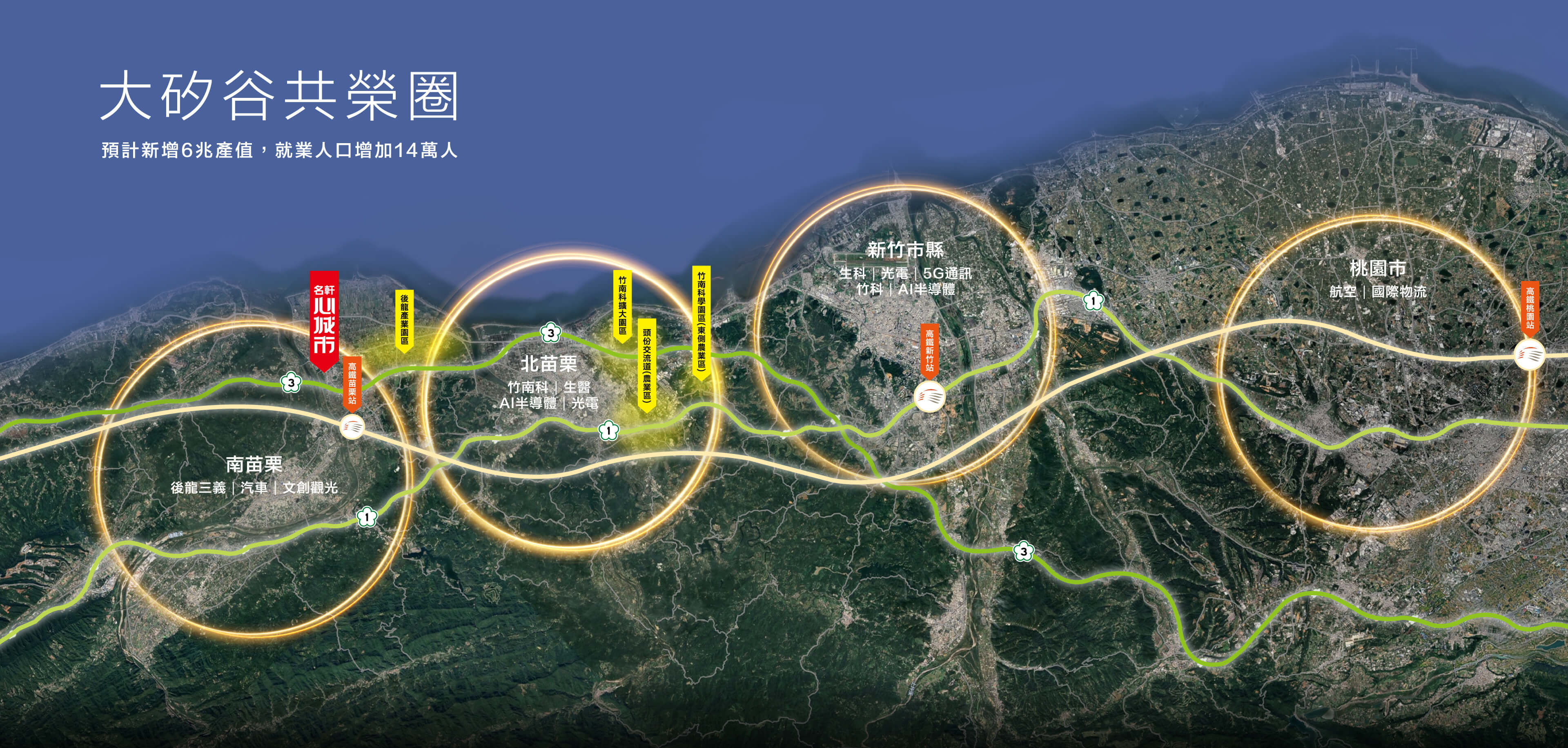 串聯竹南科、銅鑼科學園區,晉升大矽谷科技主角;約8分鐘接軌高鐵,竹北、台中雙城無縫版圖,輕鬆打破時間侷限。鎖定雙強前景,看見苗栗巨星,慧眼搶佔,勢在必行。